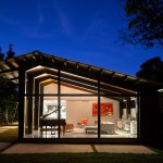 Steel girders and custom steel framework with expanses of glass walls encase the jewel box family room, a new addition that extends the interior space into the outdoor landscape. A plywood cypress ceiling reaches a height of 14 feet giving the airy respite volume.