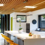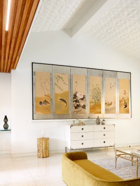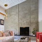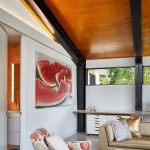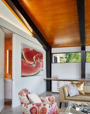 The red brick living room fireplace surround was resurfaced with hand troweled soft gray plaster that was repeated on the kitchens waterproofed back splash. An original three pendant light fixture was refurbished and now hangs in the living area where the vaulted ceiling is given a retro redo with sculptural ceiling tiles.
