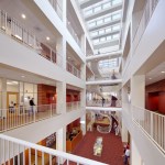 The complex features underground parking for 870 cars, an indoor/outdoor dining hall, 600-person lecture hall, and an abundance of classrooms, offices and amenities. The project’s architecture captures the essence of Stanford and provides a physical framework for the GSB’s new curriculum that emphasizes small classroom size, interdisciplinary collaboration and experiential teaching methods.