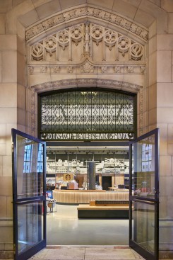 Original elements within the space, including the original doors, ornate iron scrollwork, and original steel-framed, stained-glass windows, were preserved. The windows provide natural light into the partial-basement space. New elements such as metalwork and columns reference the building’s metal structural features. New ceiling finishes and lighting (featuring LED light fixtures), new flooring, and low-emitting paints and coatings.