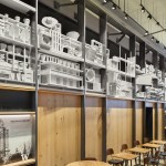 The public spaces of the café are separated from the back-of-house by a large, steel-and-wood screen wall which houses a commissioned multi-media art piece. The 40-foot sculpture is made with found coffee-related objects, and historical objects from the Suzzallo Library, along with hand-fabricated elements and reclaimed wood. The concept was inspired by the ornate detailing on Suzzallo Library’s façade and the hand-carved friezes atop the oak bookcases that line the library walls. Local artist Matthew Olds, who studied art at the UW, created the multi-layered art work to tell the story of the many hands involved in the coffee journey, from bean to cup.