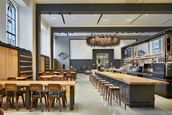 To organize the space, large-scale elements were introduced to serve provide an underlying structure. A large service island (13’-9” x 33’-6”), wrapped by reclaimed wood and two-tone cement flooring, takes center stage. On one side of the island are grab-and-go cases and espresso machines stations. On the opposite side is a long specialty coffee bar. Surrounding the island is seating for more than 100 customers through a mix of lounge chairs, soft sofas, café and bar seating, as well as community tables—all with easy access to electrical convenience outlets. Custom wood and steel sliding panels wrap the room’s perimeter and provide concealed access to existing mechanical equipment.