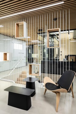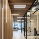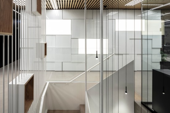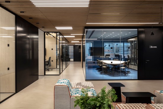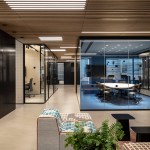 Levels two and three provide a home for SNC's employees and are the heart and daily operations of the organization. Kimmel Eshkolot Architects' design of the work spaces oscillates between a formal and laid-back environment with sleek transparent glass offices, wooden finishes and carefully aligned barriers providing a dual sense of open work flow and individual spatial privacy. The architectural configuration and internal design language speaks to the needs of the tech world – quiet productivity open to bursts of creative energy — and aspires for precision and practicality. The transparent glass exterior provides views of downtown Tel Aviv's skyscraper skyline and neighboring eclectic 20th century buildings.
