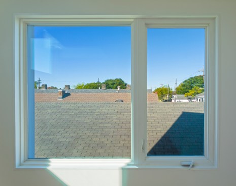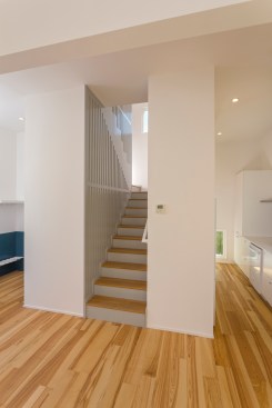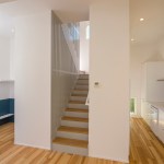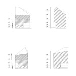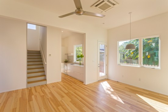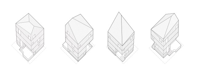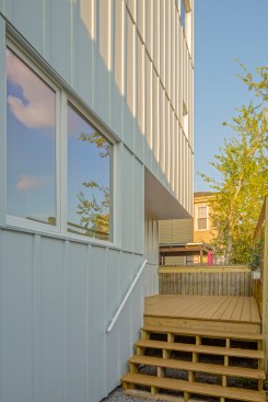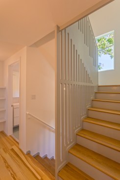 The overall form, ambiguously reminiscent of a traditional home, was devised to manipulate the perception of its true height and scale. The massing moves up and out, reflecting the open space requirements of the first floor and the need to maximize permitted buildable area on the remaining floors. This is further reinforced with the detailing of the exterior cladding. Like other Starter Home* projects, 4514 S Saratoga needed to utilize a ubiquitous and cheap material. In this case conventional cementitious panels were detailed to step out at controlled intervals to obscure the height of floor plates. Vertical batten strips, placed at varying widths, were misaligned to reinforce the stepped banding. From the street the upper floor is encapsulated in the volume of the roof, with the eve line no higher than a typical two-story home. The form opens up towards the rear and side to allow windows into the third-floor room. This peaked portion of the home, while not immediately present from its own street front, is seen along adjacent streets in an intentional interaction with the adjacent rooftop dormers, uncannily present though not entirely clear where it belongs.