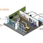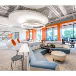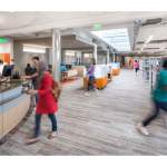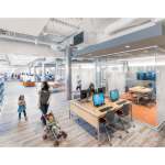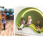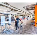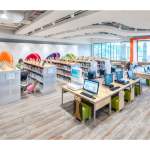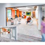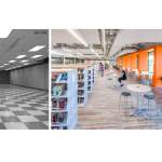 How does one insert a state of the art library into a 20 year old shopping center that has seen better days? With creativity and innovation! The story of Sterling Library is a story of renewal, repurpose, and above all: hope for the future! It all started when Loudoun County leased three abandoned storefronts and hired Grimm + Parker Architects to design the 14,500 sq. ft. space into a bustling new library for the community in Sterling Virginia. Due to lease and budget limitations, there was no opportunity to alter the exterior or add curb appeal of any kind, rendering this an interior-only renovation. One of the greatest design challenges in this project was adding natural light to the 90’ deep space where the existing exterior storefront windows offered the only natural light and the rear load-bearing wall had to remain entirely free of openings. The solution locates the most prominent active spaces along the front with floor-to-ceiling storefront windows to better attract passersby into the library and added ceiling sky-lights towards the rear, affording new natural light to the meeting and study rooms located deeper into the quieter parts of the library. Upon entering the library, a zone to the left is dedicated to the Teen Center with computers, gaming screens, and fun furniture. A movable glass wall separates the Teen Center from the rest of the library offering the option to acoustically enclose the space, while keeping a visual connection at all times if teenager gatherings get active and loud, as they often do. Along the exterior storefront windows are café style seating areas offering a variety of gathering options for visitors. Parents can read, study, meet, or simply relax while their children enjoy the “jelly bean” cut-out nooks in the children’s area. The entire space is designed to be flexible and transformable. The interior spaces come to life with lively colors accentuated by the natural daylight from new skylights, and flexible furnishings to support a variety of activities – from festive to reflective. In the main library, a sculpted curvy ceiling was designed to draw visitors through the space. Along the paths are computers, a maker space, rooms for business incubation, tutoring and conference rooms, and a community meeting room. Sterling library has become a beacon and a destination in the older shopping center and is helping to give it a second life! It glows at night from a distance and draws visitors in throughout the day. Whether it’s learning to sew, recording music, or cuddling up with a book, children, teens, and adults of all ages can find a special place just for them in the new space. The new library has inspired and revived an older, “has-been” shopping center into a new, hip and hang out destination, a place to see and be seen, learn and engage neighbors and friends.