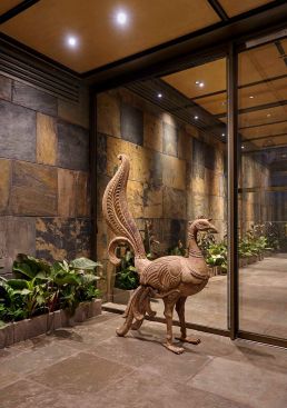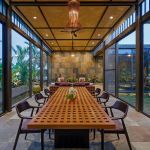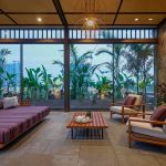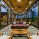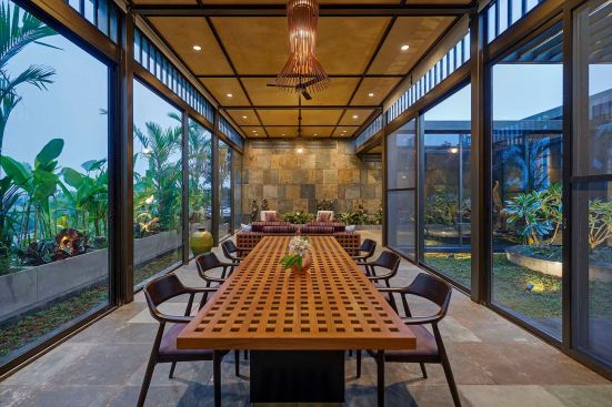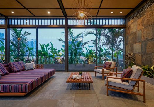 Walking into the main terrace space, one witnesses the heart of the layout being occupied by verdure and manicured landscape that manifests as the central courtyard. The glass walls of the built spaces hug the edges of the courtyard, creating a flow of circulation around the focal greenery. Tropical plants and hedges grow out and provide the Sthira lounge with the desired privacy.