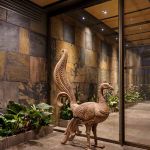 The furniture across the family areas is cohesive in its appearance due to homogenous materiality; the dining table and lounge coffee table are built using the same wood and are perforated to add to the visual light-weightedness of the pieces in the expansive volume of the space. The choice of upholstery and fabrics is consciously kept pared-down, allowing the minimal prints and hues to become a part of the lounge’s narrative. Sthira’s design grammar has been peppered tastefully, via the inclusion of antique sculptures like the traditional avian and wooden canoe boat, which add to the space’s vernacular elementality. The tall sculpted pots in earthen hues are also sourced from a local Artist, which brings the context’s craftsmanship to Sthira.