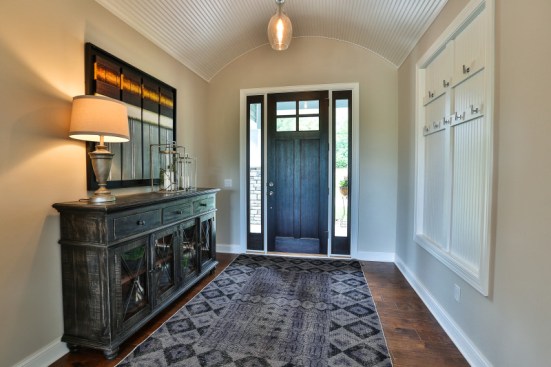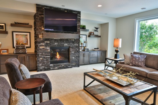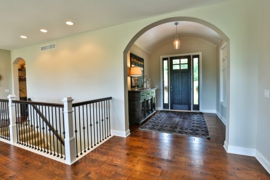 This single family home located in Stillwater, Minnesota features a modern appeal – all combined with more traditional aesthetics and darker shades. Stone veneer highlights the living room fireplace area with built-in cabinets and shelving on each side. Meanwhile, the home’s front entrance features an oval-shaped ceiling, nearby a staircase that leads to the lower level. Built by Creative Homes.