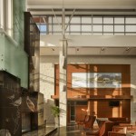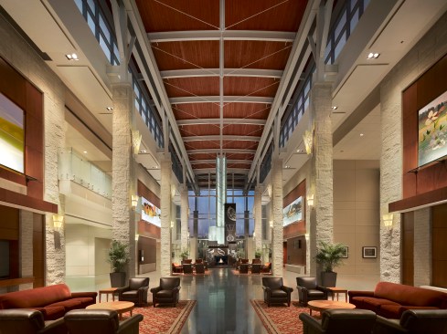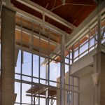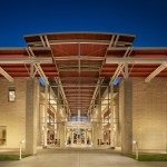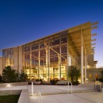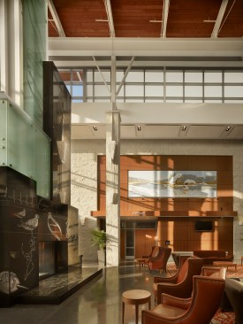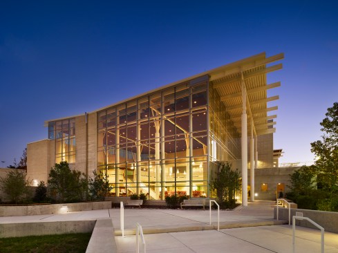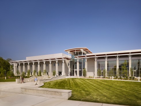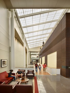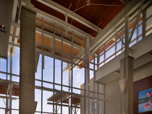 The design translates the existing forested transition between the college and outside community by using organic, nature-inspired architectural details such as soaring columns topped by outstretched trusses reminiscent of tree limbs, and a drop ceiling canopy created from wood panels. Sustainable design elements include an Aquifer Thermal Energy Storage, an energy-efficient geothermal heating and cooling system.