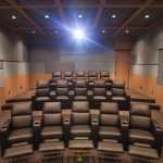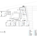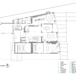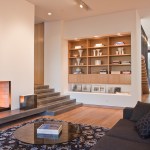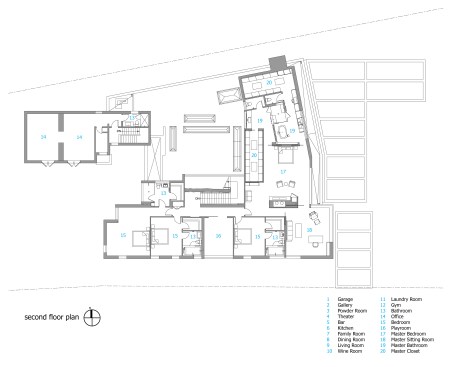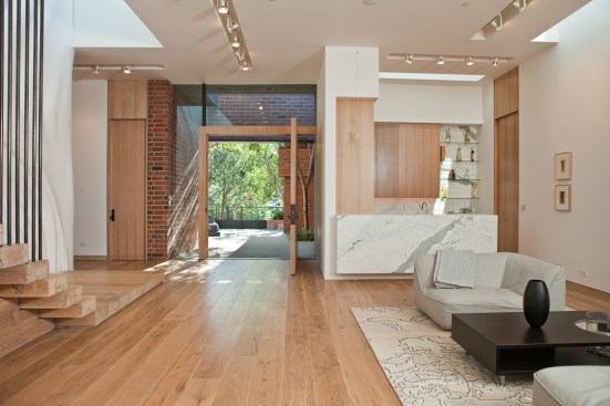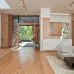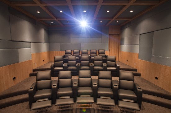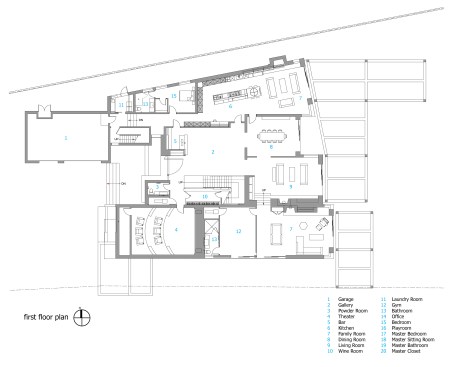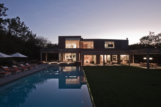 The interior spaces are affiliated with a focus on elemental wood and stone materials. The ground floor includes a large working kitchen, a family room, and appointed home theater.