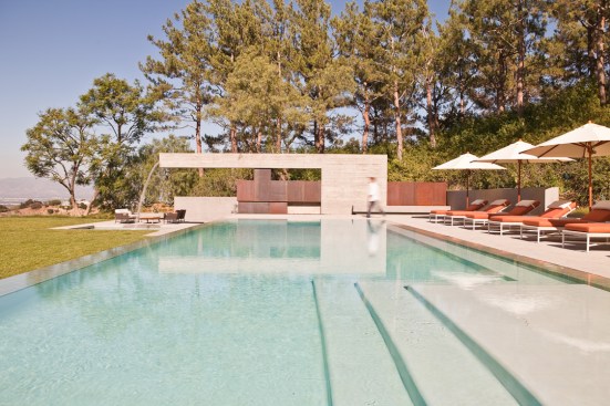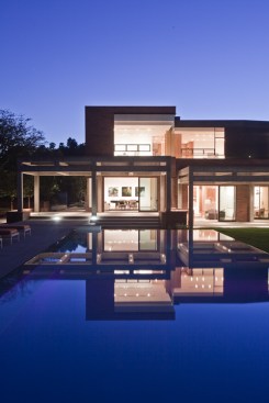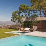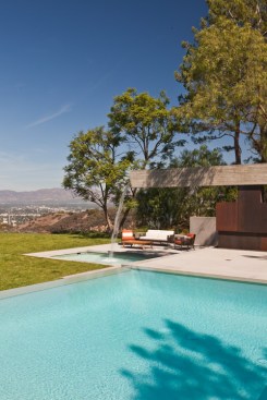 Sitting on a uniquely perched site overlooking the San Fernando Valley, the renovation reconnects the residence with its site through large restructured openings and a comprehensive landscaping effort. Along with its expansive lawn and native vegetation, the back yard focal piece is an Olympic-sized infinity-edge pool and Barragan inspired poured-in-place cantilevered concrete water fountain.