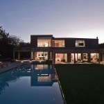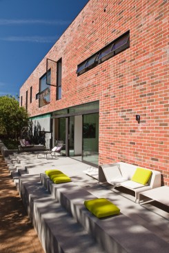 A second-floor addition, looking out on to the back yard and San Fernando Valley unifies the building made of a large mass of brick-faced forms. One of the design goals was to retain and celebrate the original exterior and compliment it with large expanses of glass and dark steel support elements, carefully integrated with the existing brick clad volumes of the home to achieve a dynamic and unified composition.