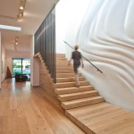 A custom designed rough-sawn lumber staircase with a rippling and custom-molded wall that gives the illusion of a fabric curtain blowing in the wind leads to the upper floor reserved for guest bedrooms and an open-flowing 2100-square-feet master bedroom suite.