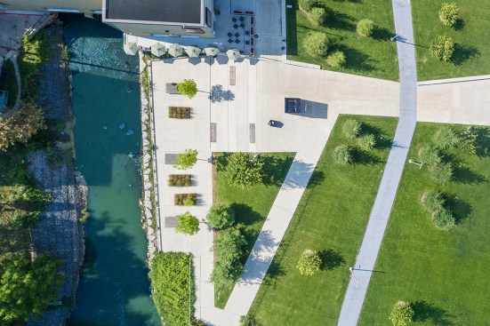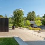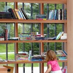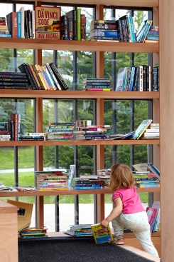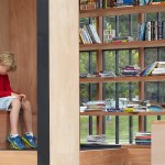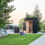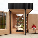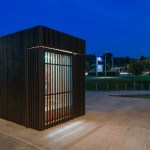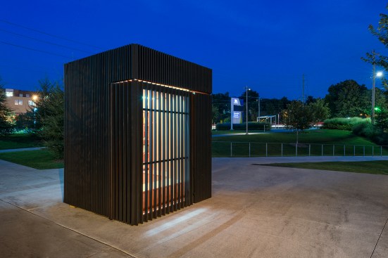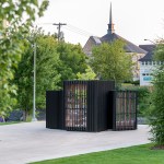The Story Pod echoes AKB’s renowned residential projects with a pure, simple form that belies a deeply thoughtful approach to architecture. The abstract, black volume — a compact 8’ w by 8’ d by 10’ h — acts as an urban marker, drawing curious residents from nearby Main Street and an adjacent riverside walking trail. As users move around the box, the rhythm of its vertical slats changes. The tightest spacing articulates opaque walls; the larger gaps, backed by transparent Lexan, allow light and views to filter through; and the widest openings display the book stacks, showcasing the spines and encouraging eager readers to come in.
