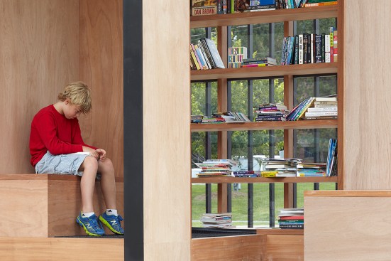 The Story Pod’s ethos of community comes from the roots of the design process. The concept was initiated by HollisWealth, who donated funds for the purchase of materials. AKB undertook the project pro bono. The studio carefully considered how to make the design aesthetically pleasing and functional, as well as ecological, economical and easy to build so that a volunteer construction crew could assemble it. Drawing on their experience designing a ski chalet with a tight timeframe and budget, AKB used standard dimension lumber and plywood — which minimized production waste — doing so with clever proportioning, rhythm and balance to create something graceful. Town of Newmarket employees, none of whom are fulltime professional contractors, dedicated their work days in a cordoned off corner of a municipally owned machine shop to build the pod. The care they took with the details demonstrates affection for the project that will surely grow with time.