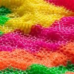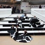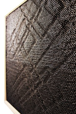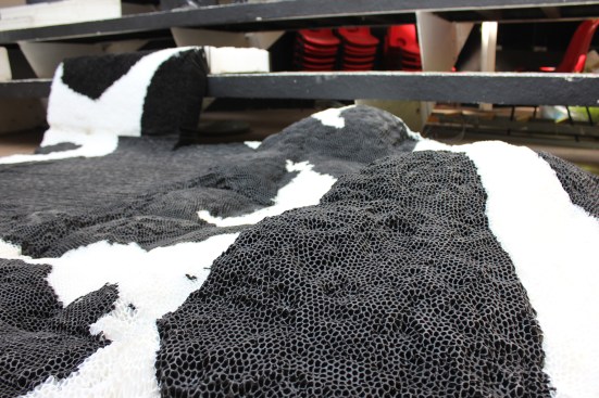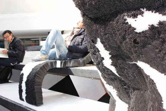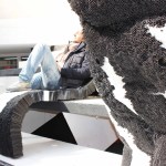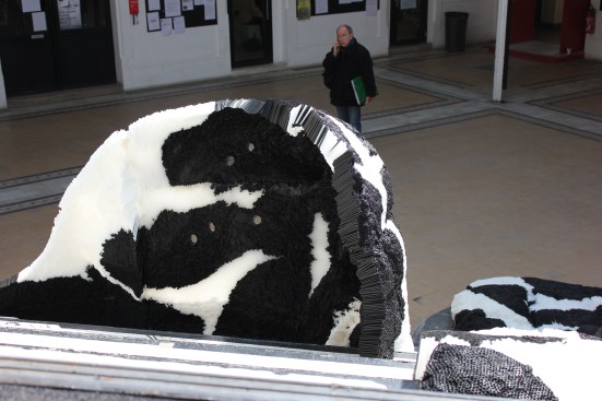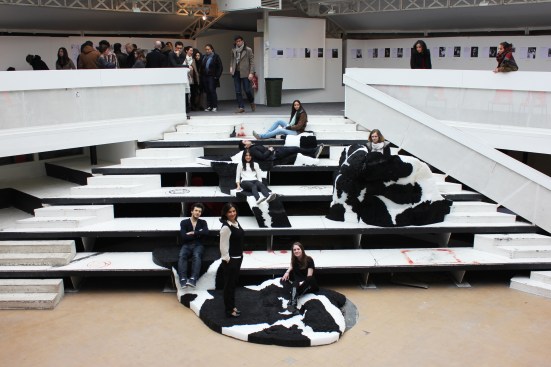 All this researches ended by the proposal of a scale 1 installation in the Ecole Speciale d’Architecture hall (Paris) made of 250 000 plastic straws for a total of 12 sqm of matter. Spread on the bleachers of the ESA main hall, the Straw-k installation was multifunction shape: a floor, a wall, a seat, a bench, etc. where the students were able for 10 days to test the qualities of the material. The installation was here to deform the black and white rigid colour repartition of the school hall into an organic shape, giving for the first time a real function to the bleachers and a singular atmosphere to the place.