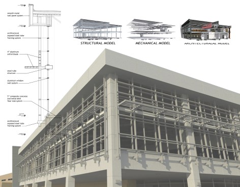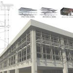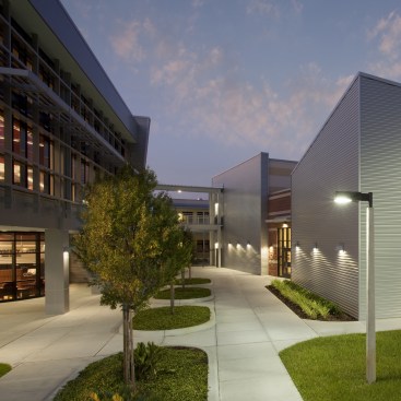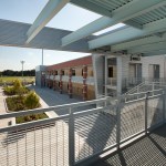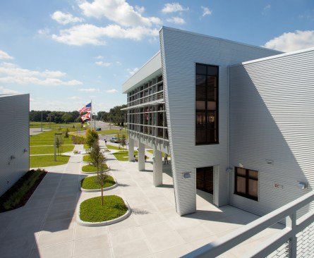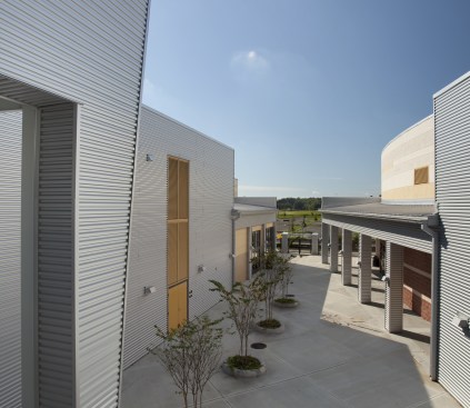 The entire site was farmed for strawberries for decades and is representative of the community’s heritage. The design concept reflects the context of agricultural fields and human cultivation of the land with the end product delivered to the “marketplace” or “market street”. The plan and building forms are skewed, sliced, and tilled like the earth. This pattern is reflected throughout the project in plan, section, material choices and layering. Textured “earth” materials in rows and forms are broken and bound by “steel plows” that define space and function, and express human transformation of the land. Material choices include split face cmu, ground face cmu, stucco, aluminum and glass wall system, and a corrugated metal panel skin. Two massive and skewed covered walkways bisect the rows of classroom buildings and become focal points for students gathering to “see and be seen”. Revolving around green design principals, the project takes advantage of an East/West axis, and places the classroom buildings along a major interstate with a retention pond as a buffer. This provides for North light to all the classrooms to maximize daylighting. The southern row of buildings houses the “public” functions including the Administration, Media Center, Gymnasium, Auditorium, Agriculture and Business functions. Together these two “rows” of buildings form an internal open air “market street” for the students to congregate and exchange ideas. In addition to daylighting, the project takes advantage of lower energy use, recycled materials, reduced potable water use, and low maintenance finishes. Intended as a prototype, this 270,000 gsf 2 story High School on 58 acres houses 2500 students including robust athletic and agricultural programs. The facility includes hardened “Enhanced Hurricane Protection Areas” for use as a public emergency shelter. All in all, this school provides the community with a visible landmark along the interstate and a focal point for gathering, while embodying the rural traditions of agriculture, sports, and “marketplace” to foster the exchange of ideas and prepare youth for a higher education.