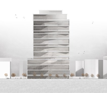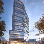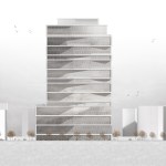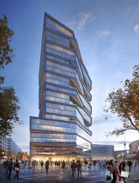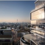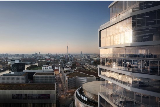 In October of last year, Gewers Pudewill won 1st prize in the invited competition for the construction of the Stream Tower, a new office high-rise in Berlin-Friedrichshain. At this highly attractive location on the Mediaspree next to the Mercedes-Benz Arena, the design envisages a sophisticated architectural solution and an urban development highlight: An emerging office tower that is to reach a height of approx 90m, encompassing a gross floor area of 42,000 sqm. The design elaborates on the theme of vertical folding, expressed throughout its 24 stories by means of the slabs and facades, thus generating an interesting urban sculpture that treats both the plinth and tower floors equally in terms of design, with the sides of the tower oriented to the edges of the surrounding buildings to better arrange itself into the urban fabric. Starting with the ground floor, the floors fold themselves upward, articulating the slabs and exterior walls without breaks or jumps and introducing this play with the respective elements while utilizing only two alternating floor plan solutions. An attractive, yet clear and comprehensible tower edifice emerges, appearing both manifold and varied without being restless. The folds alternate from west to east, with the facades to the south and north being predominantly glazed, offering spectacular and very generous views over Berlin – especially from the 7th floor onward, it being the first tower floor to rise above the neighboring buildings. On each level of the building arise two terraces that can be well utilized—one to the southeast and one to the west – as well as the addition of various lounges and meeting rooms throughout, all of which allow for a modern office structure.