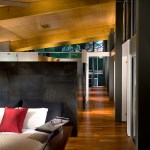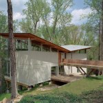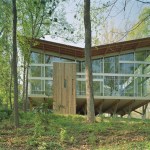 At all times of the day, the house is filled with a view of nature and, by day, dappled light. Deep roof overhangs extend a visual link to the outside and shade the glass. Laminated wood columns and beams, plainly bracketed, strengthen the presence of nature, add an element of warmth to the interior, and echo the trees beyond. The roof beams reach out to the sky like tree limbs.