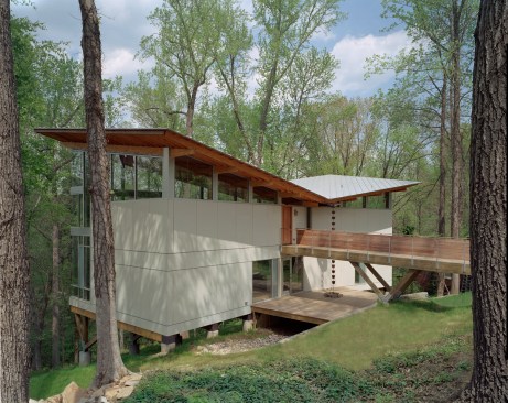 The site is a steep, north-facing escarpment 80 feet above Crabtree Creek, shaded by a then-150-year-old beech and oak forest. The creek has carved this escarpment for millions of years, which immediately suggested a site of great ecological sensitivity. We knew we had to build upon it carefully.