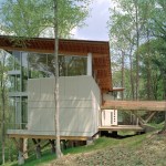 The house was designed primarily for one person who had three specific requirements: (1) she wanted “something dramatic;” (2) She wanted to feel “as if I’m living in the trees;” and (3) she wanted the house to be utterly devoid of unnecessary ornamentation to the point that she could see the marks of construction, from exposed bolts to the “unfinished” ceiling structure.