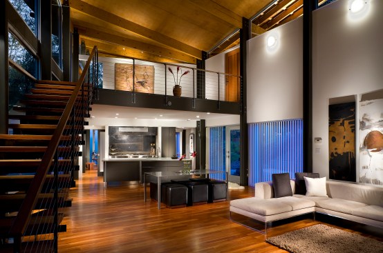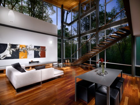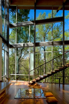 The entrance to the house is a progression from the top of the hill, across a bridge, and into a balcony foyer, at which point the drama of the scenery outside fills the interior through two-story, floor-to-ceiling, north-facing glass walls. From the balcony, a graceful steel staircase with wooden treads descends past the glass (in essence, through the trees) to the dramatic, two-story-clear main living floor, which, in turn, opens onto a sunny and partially secluded south-facing terrace below the bridge.
