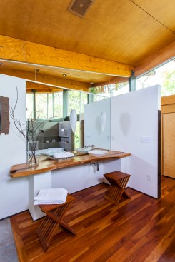 Careful arrangement of glazing, even on the more private, street-facing elevation, maintains a sense of transparency and delicacy. This is consistent throughout the interior: Partition walls between rooms stop short of reaching the exposed-wood ceiling and pocket doors between spaces feature “frosted” central panels in the spirit of shoji screens. The balcony-level floor includes the master bedroom suite. The main floor includes the living/dining space/kitchen space (open to each other), another full bathroom, and an additional cozy “bedroom” space that the owner uses as a media room.