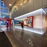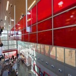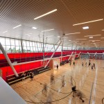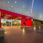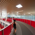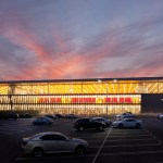 The Student Recreation Center strategically creates a strong bookend to the east end of the campus, providing a dynamic, energetic approach to recreation. The design concept is clearly executed with a judicious use of colors and finishes. Upon entering the building natural lighting and material choices raise excitement and motivate movement. As an athletic building, it captures the energy and impetus of the various sporting activities inside. Strong transparency and interconnections between spaces inside the building are appealing, inviting and conducive to exercising. Compositionally it is assured and confident. Its community connection is highly apparent. Rainwater collection, natural ventilation, and day lighting are strong sustainable design features that are nicely integrated into the design. It was evident to the jury that students were involved in the conceptualization process and planning.