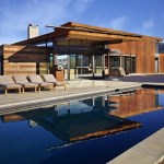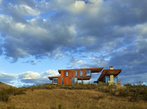 Public areas, including the family room, kitchen, and bar are grouped together in the main building. Private areas – the master bedroom, kids’ bedroom, and den – are separated in an adjacent structure, with guest rooms in yet another, isolated to allow for independent use. A fourth structure houses a sauna, removed from the cluster of activity frames a view looking out over the valley below.