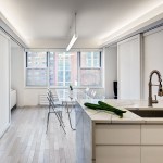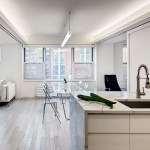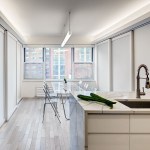 In New York, where real estate it at a premium residential design can benefit from flex space planning. In combining two small 450 square foot studio apartments, Lilian H Weinreich Architects creates a smart, flexible, efficient space that can easily adapt to numerous living, entertaining, and working scenarios. By purchasing 20 square foot of public hallway an easy free-flow circulation could be created.