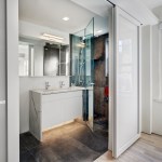 The apartment contains at its core an enlarged open loft-like kitchen and island counter—the heart of the space around which the other spaces adjust and converge. The entertainment / living / study areas can flex into three separate bedrooms with two full bathrooms and a laundry closet or a variety of other combinations. The entire apartment is designed without swing doors in order to not obstruct the flow nor the openness of space. The sliding doors to the master bathroom enable an otherwise non-compliant bathroom to be handicapped accessible by accommodating the required 5ft turning radius in the adjacent bedroom space. All closet doors throughout have a dual function both as room divider and closet door.