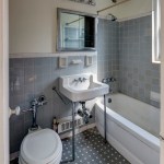 Natural materials—including solid white ash flooring and a dramatic veined Venetian solid surface material wrap around countertops in the kitchen and master bath—provide touches of neutrals that contrast the apartment’s minimal color palette of whites. Large grey porcelain tiles ground the master and guest baths.