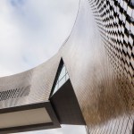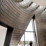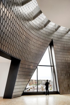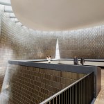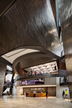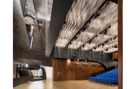 Rising in nine interlocking towers, clad in custom-glazed terra cotta tile, Studio Bell references acoustic vessels in its subtly curved design. The building is comprised of two main structural systems—the first forms the interlocking arches that span the lobby on the ground level, the second suspends the primary performance space and bridges the building’s towers from above. Walkways and stairs unite the two systems throughout Studio Bell’s five stories, where an interplay of glazed tile reflects and amplifies light and sound.