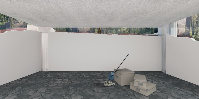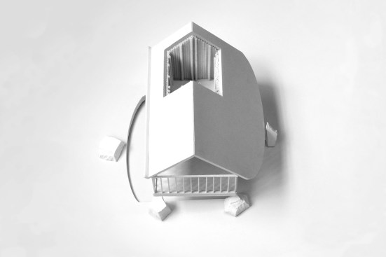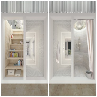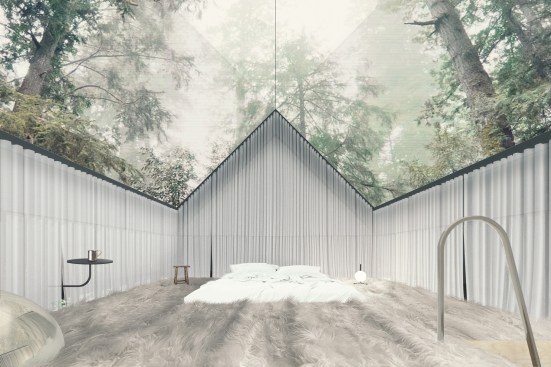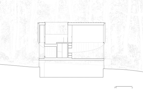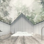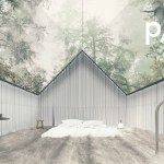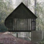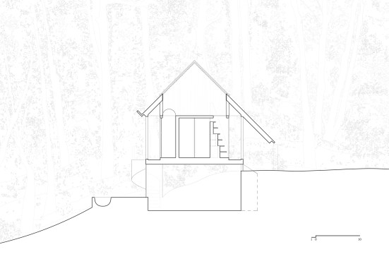 Yet turning half of a house into a not-house was only one part of the designers’ canny gamesmanship. Sitting in a clearing, perched on a series of composite stone stumps and topped by a gabled roof, the design gestures toward the most primal ideation of the human dwelling place. It then carries out a calculated assault on that ideation, cutting a glazed skylight in the roof, warping the eave on one side till it almost touches the ground, and sticking services inside the stone stumps, transforming them from existential markers of “place-ness” into a doorway, a closet, a shower and even a gutter. In its conceptual and practical aspects alike, Para’s solution represents an aptly para-architectural coup, an investigation of the a priori conditions of the brief that throws in a few playful curveballs without sacrificing any of the elegance or comfort of this rustic backwoods retreat. —I.V.