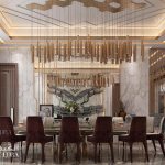 Stylish dining room in a modern luxury villa is designed for cozy family and guest dining. With a marble wall as an accent point and a contemporary style chandelier that adds charm to the overall look, the table set with chairs in noble color highlighting the sophistication of the interior.