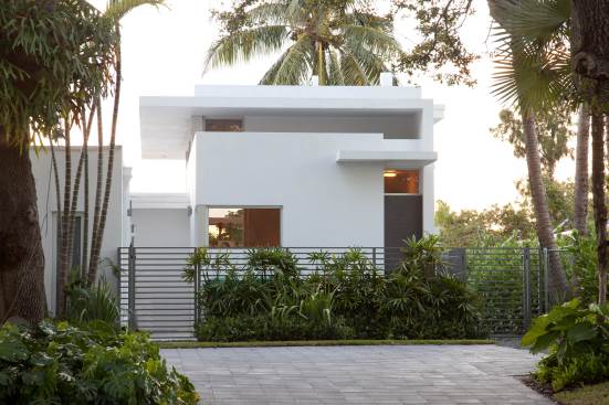 Despite the restrictions and limits on glazing/mullion ratios of the South Florida hurricane building code, the project aimed to connect the interior spaces to the outdoors in every possible way. This included large sliders, plantings at the edge of both, the studio and the covered terrace areas, as well as the linear canopies that thrust the entire setting towards the lake.