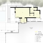 The 800 square foot studio addition seems to float above the home’s new terracing, helped by a floor plate that extends beyond the edge of the studio and is lit from underneath. Windows that face South and West are shaded by deep overhangs, while North-facing clerestory windows have no shading device, making certain the studio is filled with indirect, natural light by day. The front of the studio, facing the lake has a large storefront façade next to a large wall framing a small, square window, in a way acting as signage that this is indeed a working artist’s atelier.