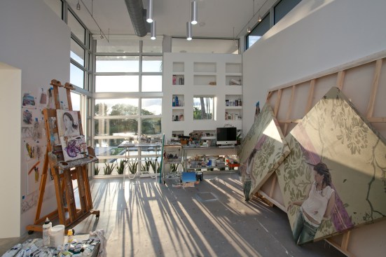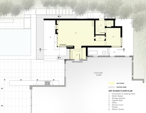 The client’s needs included a painting studio with ample work and wall space as well as vast amounts of light, an office and a bathroom; outdoor terraces, as well as a Bar-B-Q area that would support serving and entertaining functions.