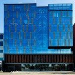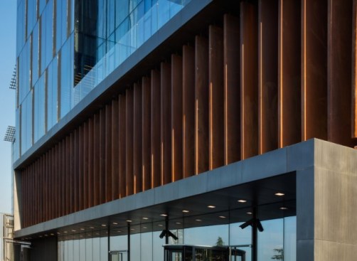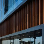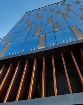 From an environmental point of view the north façade would require no shading for solar control, and there fore a totally transparent glass façade would be possible. Interestingly the brief included a two-floor car-parking requirement using mechanical stack car systems on both the entrance level and the first floor, these floors having the higher ceiling heights that also allow for this to happen. The floors need to remain open to the atmosphere, allowing natural air-flow, but obviously our approach was to differentiate this in the composition without making it look like a car-park. Thus the main entrance to the offices and the car park are placed at opposite ends, with a small café/shop unit in the middle to enliven the streetscape in front of the building. The main car park level is distinguished by a layering of large scale louvers of corten steel, backed by a finer grain of anthracite coloured open aluminum vertical louvers which provide a “veil” like back drop to the cars beyond. A thick metal clad line which begins as a roof canopy / gateway wraps around the corten steel to encapsulate this gesture, forming a clear “base” to the composition. This element then becomes a terrace to the office level on the second floor.