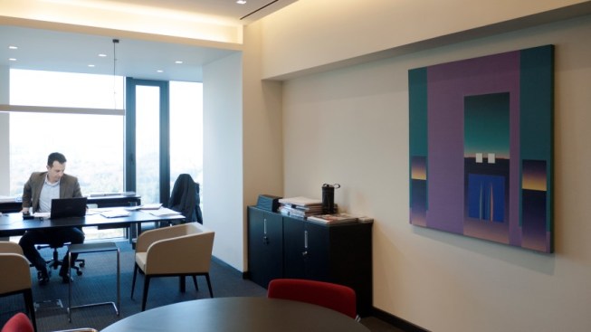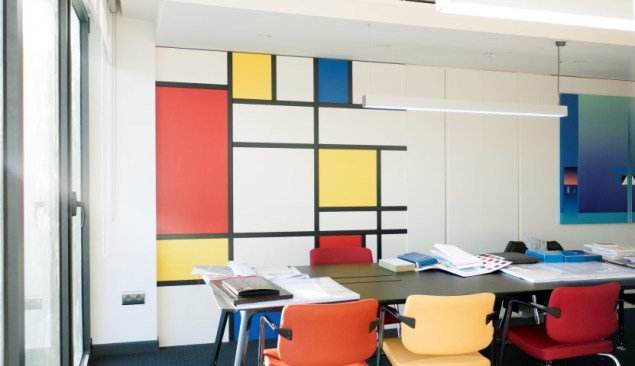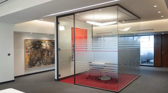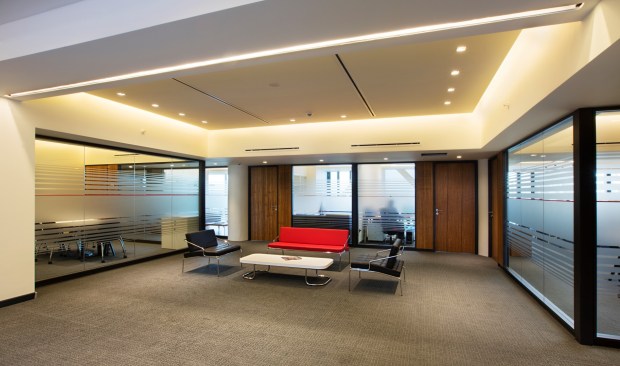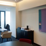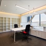 Office levels are a series of shared cellular open plan spaces and directors offices, which are arranged to the north. The darker core is utilized for reception areas and meeting rooms. The selected range of furniture from Nurus, ‘U Too’ is offset against glass interior walls with natural walnut timber wall paneling and anthracite gray glazing elements. A strong objective in the interiors was to avoid placing a flat dropped suspended ceiling through out the spaces, and to maximize the given ceiling heights. As a result the ceiling heights in each space is separately maximized and lighting sources are provided from indirect LED strips concealed within the ceilings while specific task lighting is provided by suspended LED strip lights.