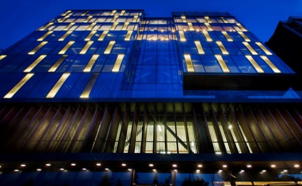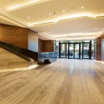 The brief for the building was to place the headquarters of SUMMA on the top three floors, allowing for a degree of flexible expansion down the floors towards the ground as the company expands. Driven by the founder of the company the lettable floors on levels 3 and 5 are sandwiched by an art gallery / workshop space which will be ran on the basis of an art space open for display of up and coming artists and a place of debate and discussion for Turkey’s fledgling art scene. All of these functions are accessed from a common ground level lobby, which is clad in American walnut on the walls and Serpeggiante grey marble on the floors. The geometries of the lobby are a surprising shift from the rectilinear composition of the façade. The black dynamic form of the Corian reception desk element engaging with the undulating dark timber walls of the space is lit by similarly undulating strips of reflected light from the ceiling. SUMMA gives a clear message to the outside world: modern, dynamic, edgy but nevertheless natural.