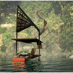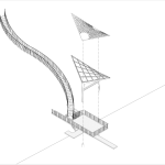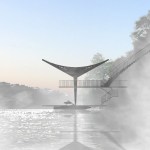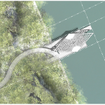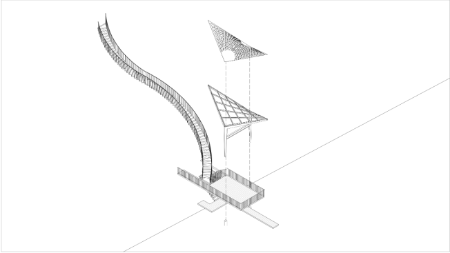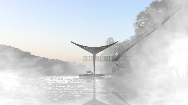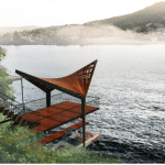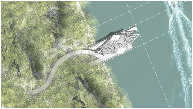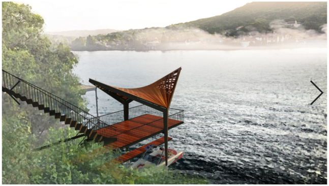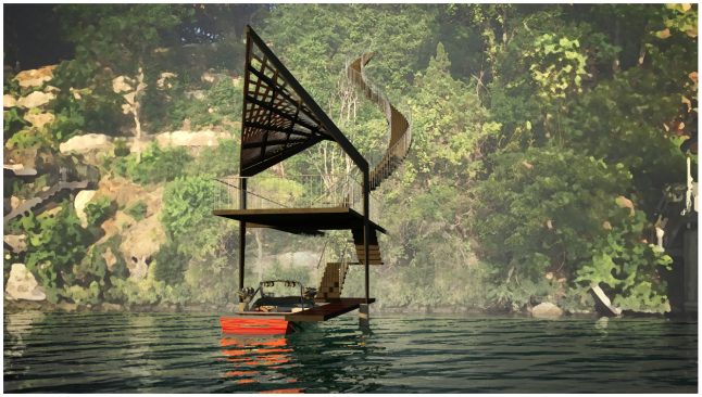 A meandering staircase tactfully winds through breaks in the sheer rock wall to access the single slip boat dock. Approaching, the hyperbolic paraboloid form- evocative of a ship’s prow, a flying kite or an egret searching for food – all images one may encounter while enjoying a relaxing day on the water, becomes visible. A vessel is moored at water level with a second floor viewing area. A net of woven wood slats, sitting atop the structure, allows dappled light to reach the deck below. With just two vertical supports, this lightweight structure is intended to touch delicately on the site.