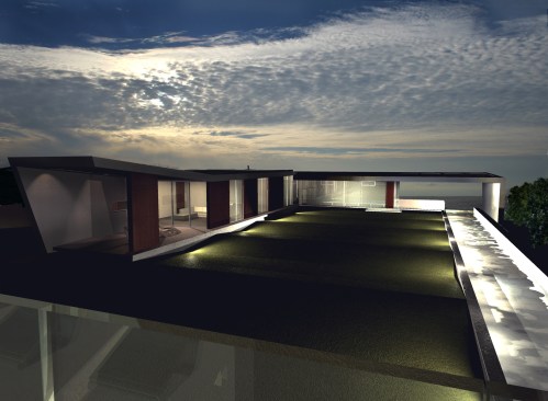 The architecture responds to this unique site by framing views in a series of movements that are experienced in a carefully choreographed sequence. From the moment that one drives onto the property a glimpse of blue-water view is revealed and framed by the roof of the Guesthouse. One then progresses through the entry gate past the guesthouse down a gently sloping set of steps where a reflecting pool / lap pool and elevated lawn area are juxtaposed with Pacific Ocean’s horizon beyond. The sequence then continues by minimizing the view as one walks down a ramp that runs the length of the pool only to expand the view again as one enters the out-door entertainment area at the base of the ramp. The main house entry leads into a loft-like space with living, dining, and family room areas which open onto each other and tall sliding doors which allow for the house to open completely to the outside.