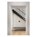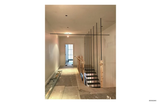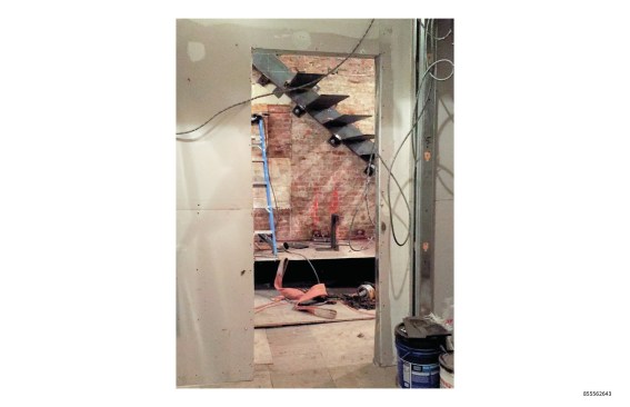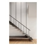 The solution that the design team developed is an elegant communicating stair that uses cantilevered and suspended members to make it “float.” Eight narrow steel rods descend from a structural beam embedded in the ceiling above the second floor, providing suspension and support for 17 knife-edged blackened-steel stair treads that emerge from the white plastered wall. These treads are anchored to a structural member concealed within the wall that is in turn bolted to the townhouse’s existing masonry bearing wall to provide cantilever support. The second tread extends the full length of the staircase’s run, providing a minimalist bench that greets visitors upon entry to the apartment.