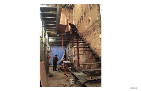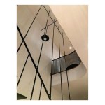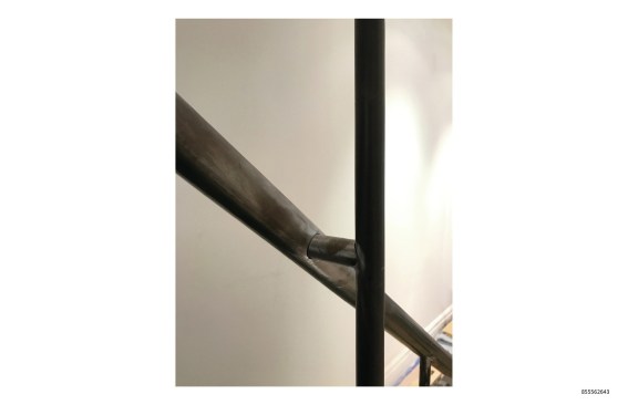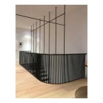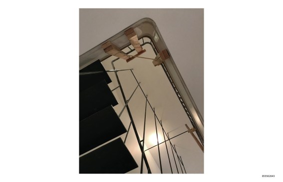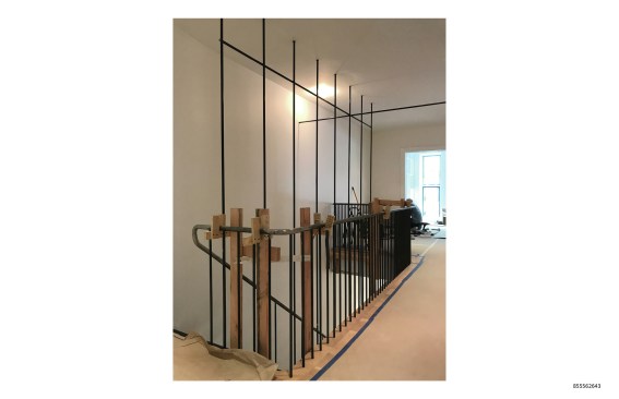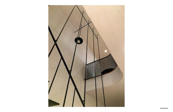 The continuous stair rail is made from the same material as the stair’s structural components and is attached to the suspension rods to provide necessary diagonal stability to the composition. The rail is the beefiest visible portion of the stair and, coupled with the twists and turns necessary to resolve the stair’s geometry, reads as a rather traditional element within the interior of the vintage building.