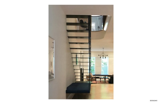 Instead of a traditional stair supported by stringers below, which would bisect the apartment and block views from the front to the back, we created a combination cantilever and suspension structural system which allows the blackened steel treads to float, hanging from above like a marionette puppet.
