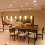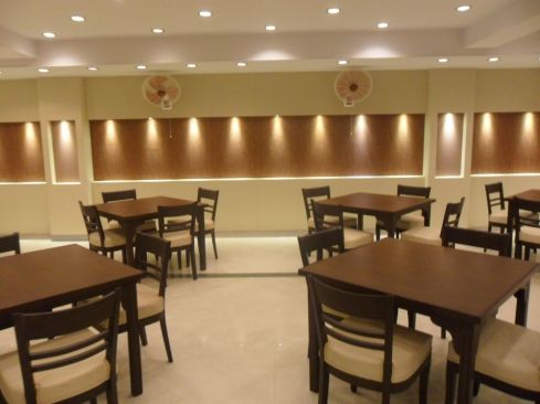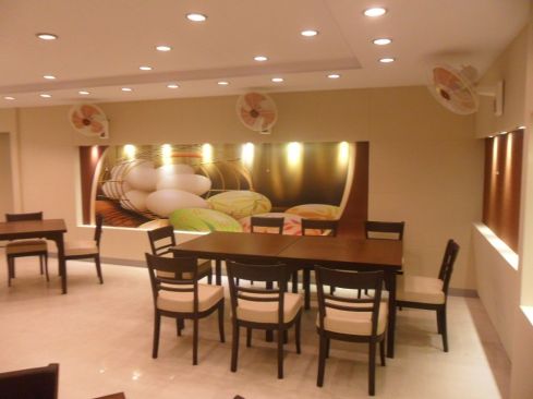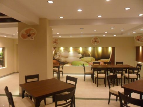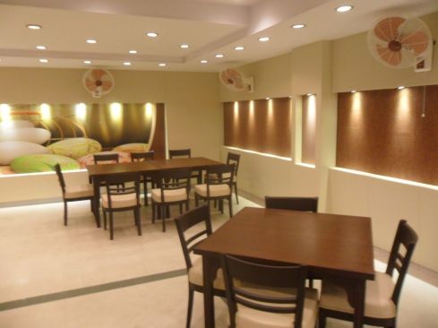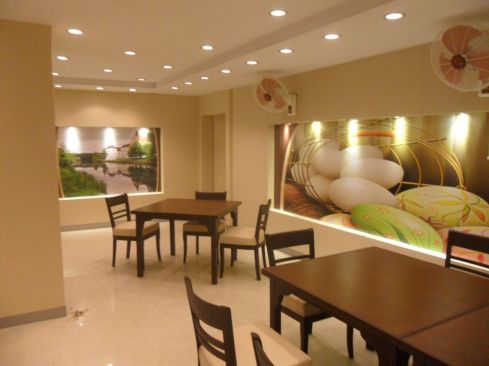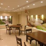 To control echo problem wall paneling is used with different size niches. Interior colors are light beige and dark wood color. Different paintings, posters of brands & products and wallpapers are used in the niches in the wall.