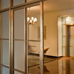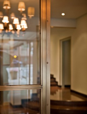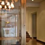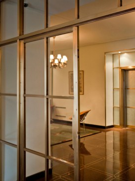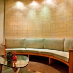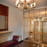 Our design removed all the colonial revival elements and the exedra screen. We introduced a grid of glass and fine bronze muntins at the elevator wall. The glazed panels are made of two sheets of glass laminated with a sheet of rice paper in between and a mirror surface at the back of the unit. The mirror reflects light through the rice paper, which makes it possible to see the fine texture of the paper. We finished the exedra wall with silver leafing to add richness and to complement the new glazed surface at the elevators. We designed a curved built-in sofa for the exedra to make it an active part of the lobby and add visual interest at the end of the space’s cross axis.