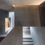 Inside the building, visitors continue on their guided journey through the pre-function area and then into the main chapel space, which features a light-filled 12m high space. There is a seamless integration with the surrounding nature as picture windows frame various man-made and natural landscapes. A mezzanine level hovers overhead to accommodate extra guests, and includes a catwalk encircling the space, allowing 360 degrees of viewing angles. The mezzanine is integrated into a wood louvered cage element which wraps around the whole upper part of the room. A grid of glowing bulb lights and delicate bronze details give a touch of opulence to the otherwise quietly monastic spaces. Custom wood furniture and crafted wood details compliment the simple material palette of gray brick, terrazzo, and concrete. Another feature of the chapel building is a separate staircase alongside the main space, which allows visitors to gain access to the rooftop for unrivaled views across the scenic lake. Various openings along this stair ascent give unexpected views both internally and externally.