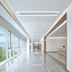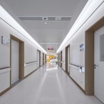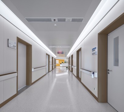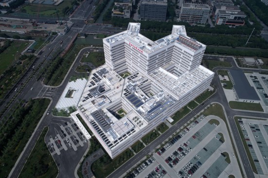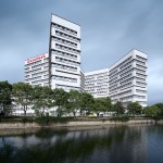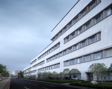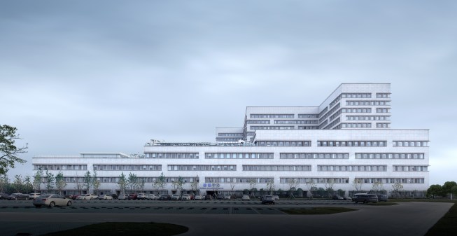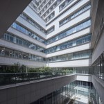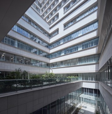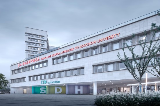 The circular cascading podium brings the garden into the building’s interior and roof; the fortyfive degree angle layout inspires rich boundary spaces around the site; the double herringbone design of dual patient areas brings higher operational efficiency to the hospital; the white walls and grey window eaves suggest the tradition of Suzhou. While avoiding overly decorative design, this efficient, modular, and growable modern garden hospital pays homage to Suzhou, a garden destination in the south of the Yangtze River.